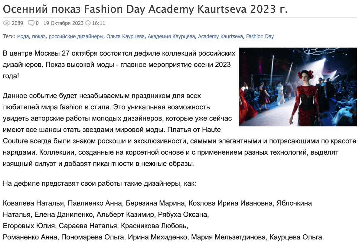 - Упоминание имени дизайнера на сайте Недели высокой моды России